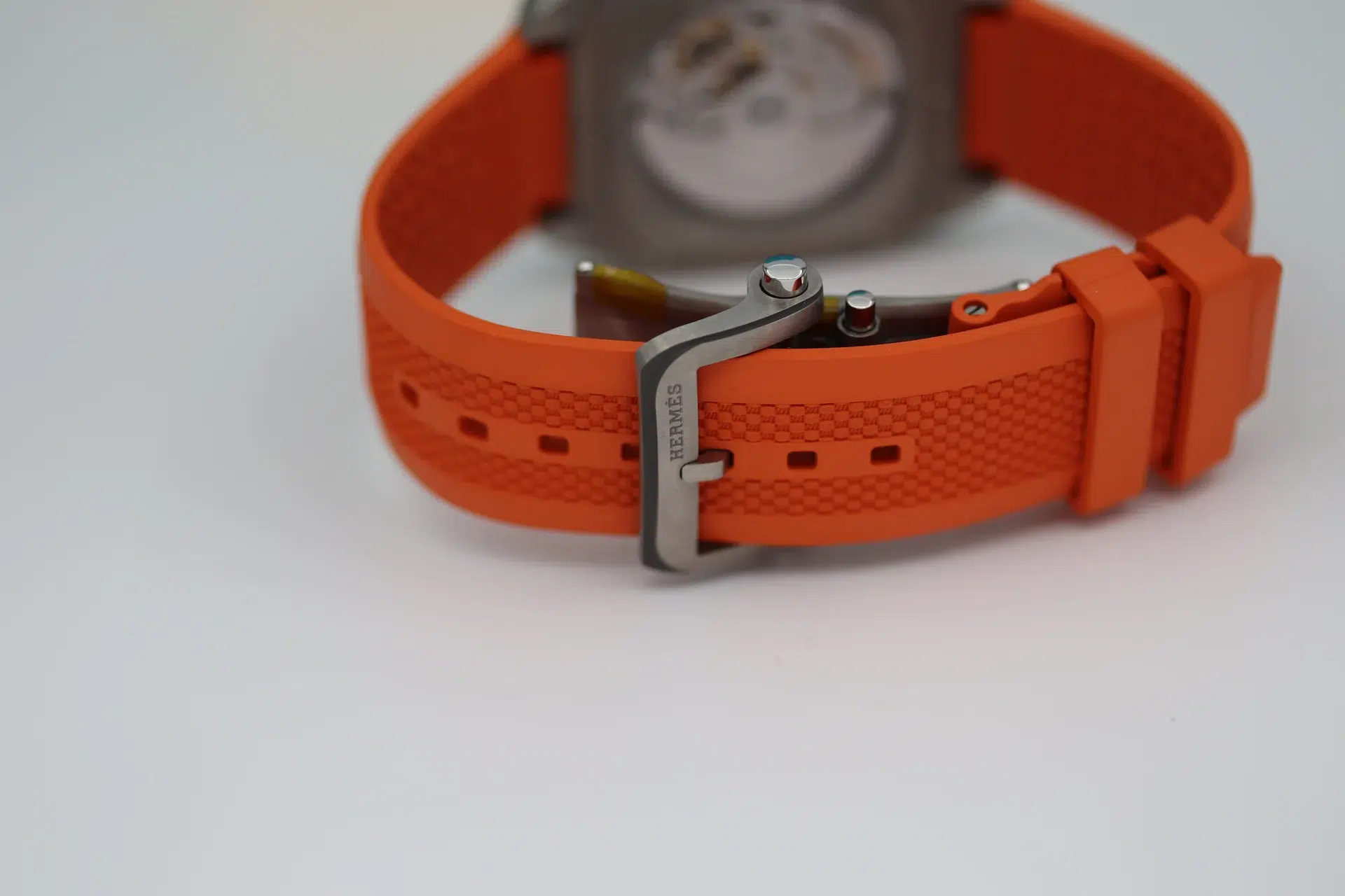 Strap: Comfortable, durable leather or rubber options with signature Hermes finish